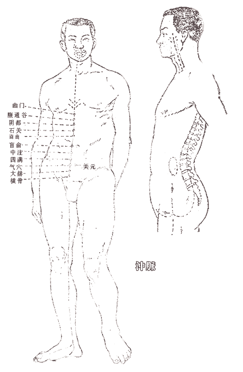 (三)冲脉的循行及其生理功能1.循行部位:起于胞宫,下出于会阴,并在此分为二支。上行支:其前行者(冲脉循行的主干部分)沿腹前壁挟脐(脐旁五分)上行,与足少阴经相并,散布于胸中,再向上行,经咽喉,环绕口唇;其后行者沿腹腔后壁,上行于脊柱内。下行支:出会阴下行,沿股内侧下行到大趾间。 2.生理功能 (1)调节十二经气血:冲脉上至于头,下至于足,贯串全身,为总领诸经气血的要冲。当经络脏腑气血有余时,冲脉能加以涵蓄和贮存;经络脏腑气血不足时,冲脉能给予灌注和补充,以维持人体各组织器官正常生理活动的需要。故有“十二经脉之海”、“五脏六腑之海”和“血海”之称。 (2)主生殖功能:冲脉起于胞宫,又称“血室”、“血海”。冲脉有调节月经的作用。冲脉与生殖功能关系密切,女性“太冲脉盛,月事以时下,故有子。”“太冲脉衰少,天癸竭地道不通。”这里所说的“太冲脉”,即指冲脉而言。另外,男子或先天冲脉未充,或后天冲脉受伤,均可导致生殖功能衰退。 (3)调节气机升降:冲脉在循行中并于足少阴,隶属于阳明,又通于厥阴,及于太阳。冲脉有调节某些脏腑(主要是肝、肾和胃)气机升降的功能。