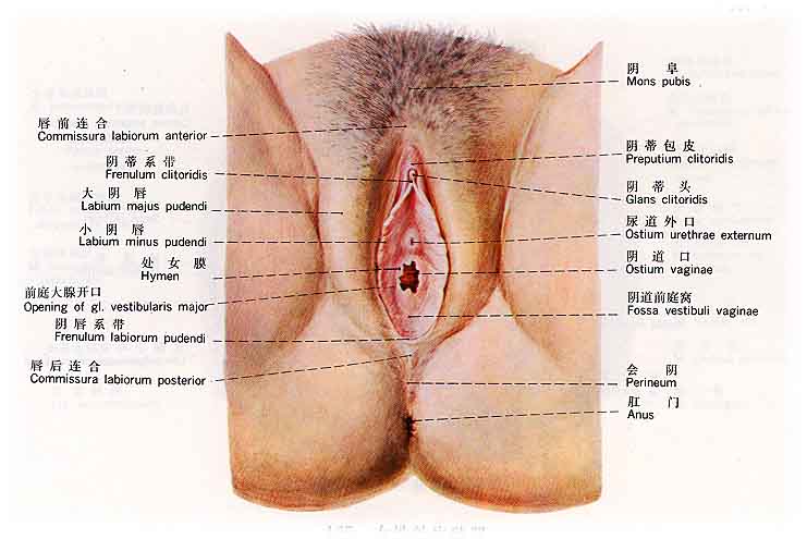 外生殖器生殖器的外露部分,又称外阴(实图)。位于耻骨联合至会阴及两股内侧之间,包括阴阜、大小阴唇、阴蒂、前庭大腺、尿道口及阴道口等。