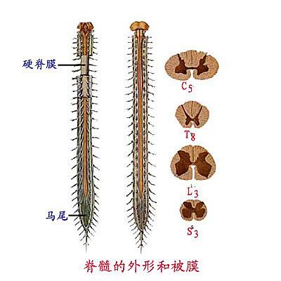 脊髓位于椎管内,上端在平枕骨大孔处接延髓,下端平第1腰椎体下缘。 Located in the spinal cord, the upper level of the foramen magnum in connection medulla oblongata, the lower level of the first lumbar lower edge. 新生儿下平第3腰椎,故临床常在3、4或4、5腰椎之间进行穿刺。 Under level 3 neonatal lumbar spine, it is often clinically between 3,4 or 4,5 lumbar puncture.