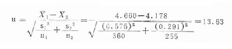 算得的统计量为u 值,按表19-3所示关系作出判断。 例19.6某地抽样调查了部分健康成人红细胞数,其中男性360人,均数为4.660×1012/L,标准差为0.575×1012/L;女性255人,均数为4.178×1012/L,标准差为0.291×1012/L,试问该地男、女红细胞数的均数有无差别? H0: μ=μ0 H1: μ≠μ0 α=0.05 今x1=4.660×1012/L,s1=0.575×1012/L,n1=360; x2=4.1781012/L,s2=0。2911012/L,n2=255.