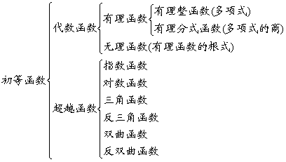 [初等函数] 幂函数、指数函数、对数函数、三角函数、反三角函数通称为“基本初等函数”,凡是由基本初等函数经过有限次四则运算以及有限次的复合步骤而构成,并能用一个数学式子表示的函数都属于初等函数.