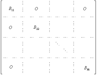 [分块对角矩阵] 主对角线上的子阵都是方阵,其余子阵都是零矩阵的分块矩阵称为分块对角矩阵.一般形式为