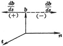 挠率的符号:当点M沿曲线的正向移动时,矢量n反向,则取正号,反之取负号(图(b)