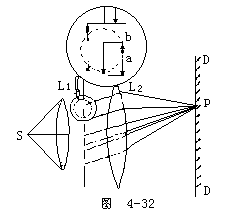 设N1和N2分别为S1和S2在屏幕上的投影点,O为N1和N2的中点,并设OP=x。从图中直角三角形S1PN1和S2PN2,可知