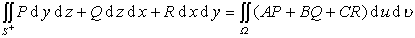 为它的正面,即由法线方向n(cosα, cosβ,cosγ)所确定的一侧,P=P(x,y,z),Q=Q(x,y,z),R=R(x,y,z)为在曲面S上有定义并且连续的函数,则