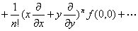 [泰勒公式]  假定在某一点(x0,y0)的邻域D内二元函数f(x,y)有直到n+1阶为止的一切连续偏导数.分别给xy以改变量hk,使连结点(x0,y0)(x0+h,y0+k)的直线段不越出D,那末f (x,y)D内可表成形式:
