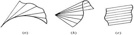 The limit position of the intersection of two adjacent planes in the ridge plane family is called the feature line of the family, and the envelope of the feature line (if it exists) is called the ridge line of the family, which divides the envelope surface into two leaves, with the ridge Lines as "sharp bobbins" of surfaces (figure ( d ) ) |